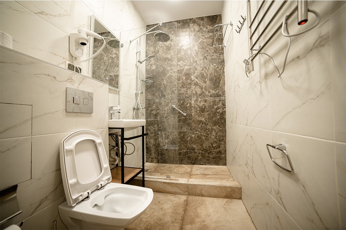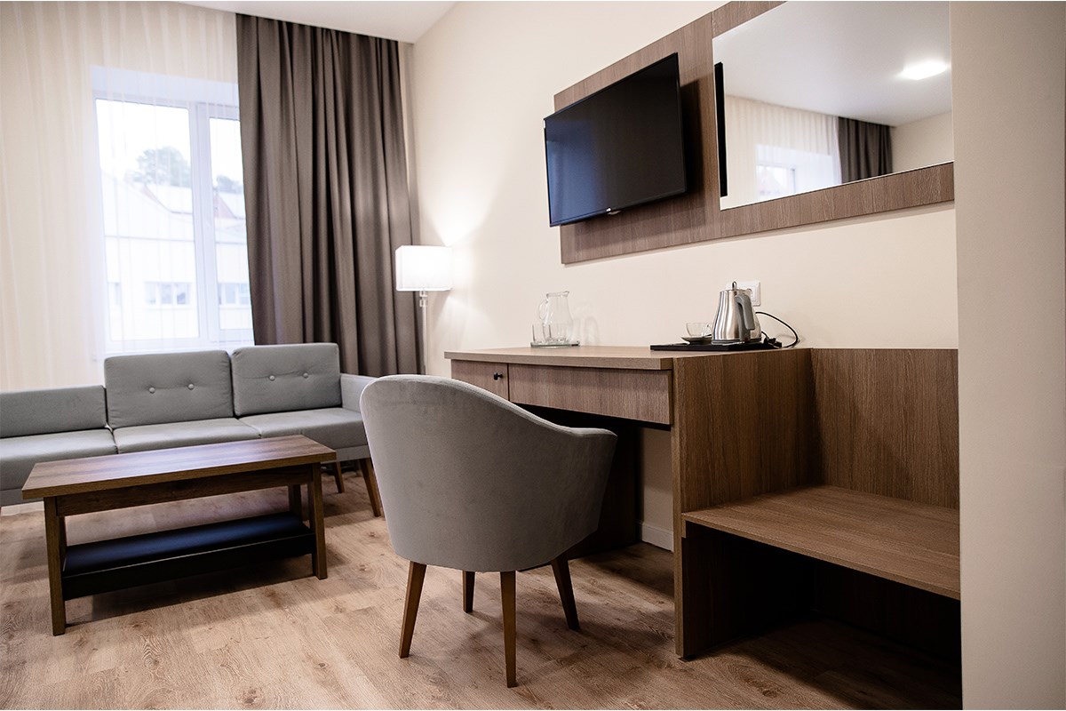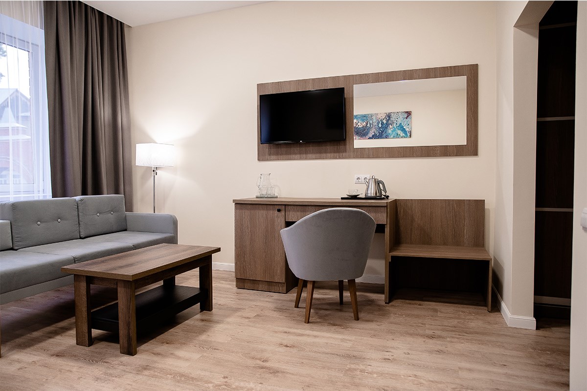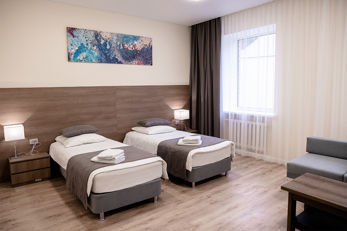 Площадь номера - 30 кв.м. 2 осн. места. 1 доп. место. Мебель: вешалка, диван, зеркало, кровати односпальные /одна двуспальная кровать, прикроватные тумбочки, стол, столик журнальный, стул, шкаф. Оборудование: сейф, телевизор, холодильник, чайный набор посуды, электрочайник. Санузел: с душем, туалетные принадлежности, фен. Сервис: Wi-Fi бесплатно, смена полотенец, смена постельного белья, уборка номера.