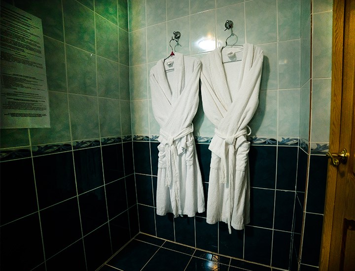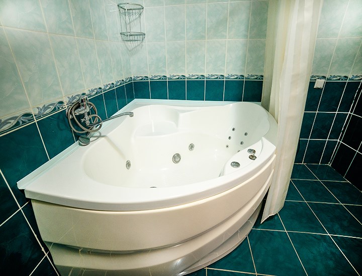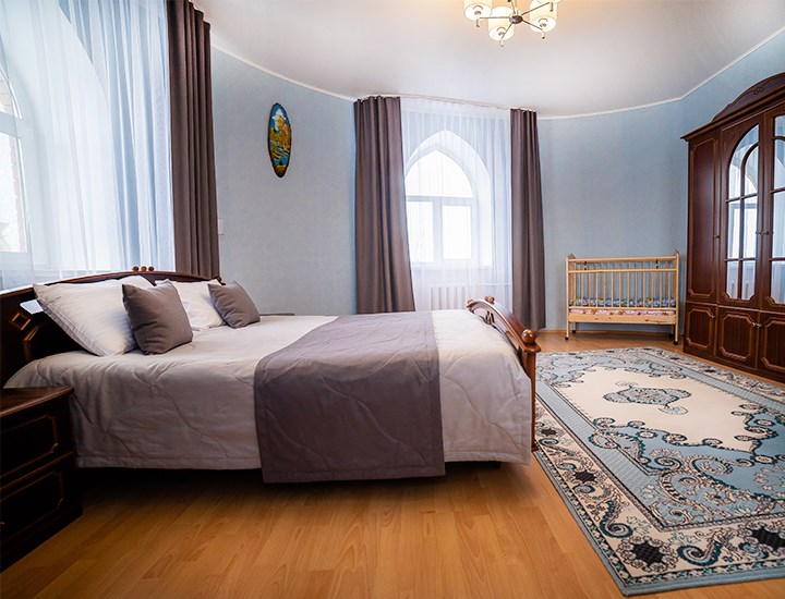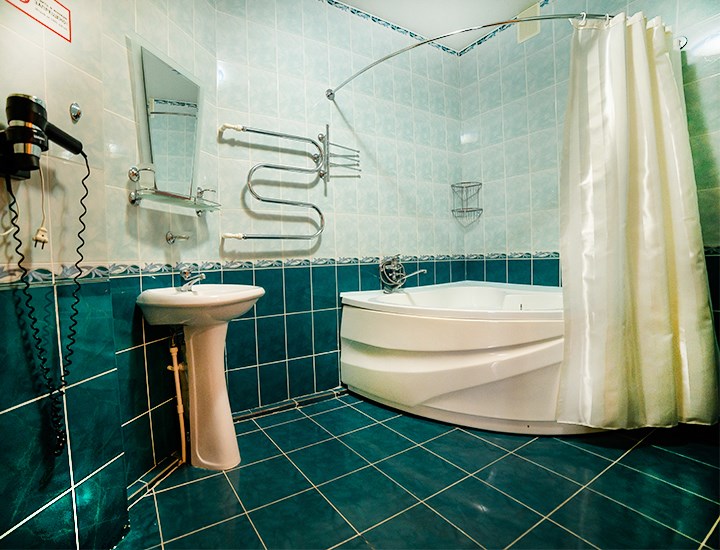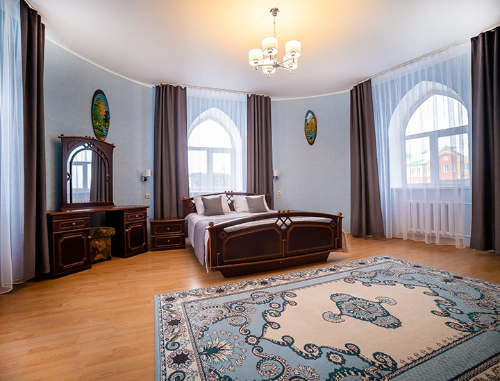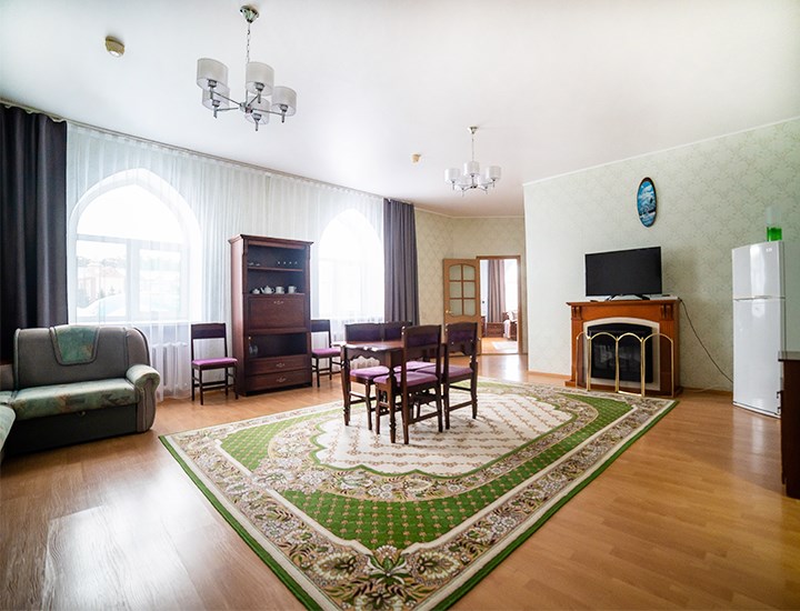 Площадь номера - 50 кв.м. 2 осн. места. 2 доп. места. Мебель: вешалка, зеркало, кровать двуспальная, набор мягкой мебели (диван, кресла), стол, столик журнальный, столик туалетный, стулья, шкаф. Оборудование: гладильная доска, телевизор, холодильник, чайный набор посуды, электрочайник. Санузел: сауна, с ванной (с гидромассажем), тапочки, туалетные принадлежности, фен, халат. Сервис: Wi-Fi бесплатно, смена полотенец, смена постельного белья, уборка номера.